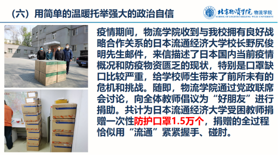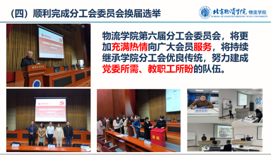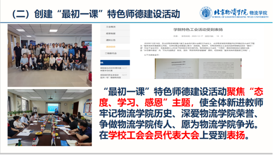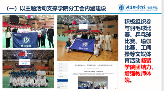 第六届工会会员代表大会第三次会议大会报告表扬。二是以青教赛为抓手不断促进青年教师教学能力水平。分工会高度重视青年教师发展,在青教赛赛制基础上,举办“教学沙龙活动”,邀请学校优秀青年教师代表现场经验分享,邀请教师发展中心和人事处分析青年教师发展规划,广大青年教师受益良多。三是以主题活动支撑学院分工会内涵建设。带领教职工参观京东“亚洲一号”智能物流园促进学院应用型建设;召开9次全体教职工大会促进学院基础工作有序开展;举办各项体育文艺健身活动不断促进教职工身心健康;倡议全体教职工为全国及国际兄弟院校抗疫捐款捐物,用简单的温暖托举强大的政治自信。
